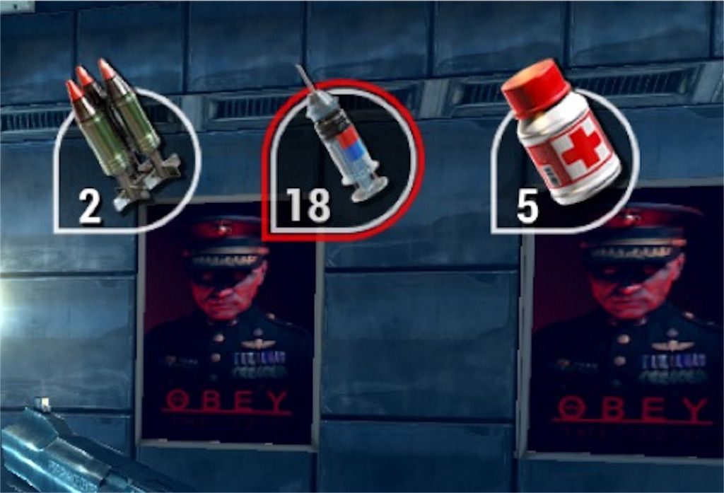 右上の銃の画像は今使っている”武器”の種類と”残弾数”を表している。
