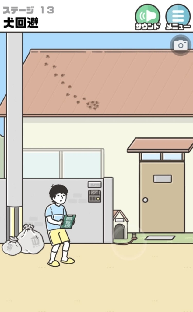 4枚目は左の小さなゴミ袋をタップすると「魚の骨」をゲットでき、それを屋根の上に使うと猫が下に降りてきます。
