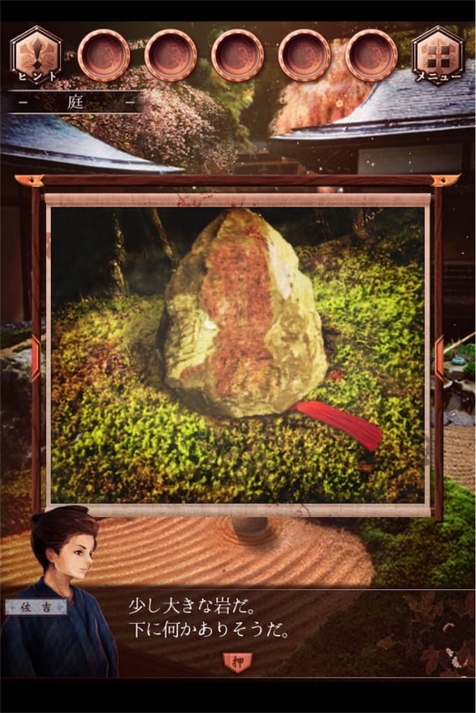 まず、庭の岩の下に「赤い紐」が挟まっています。