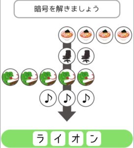 | ライオン | 各イラストの矢印の所を読んでいくと「ライオン」となる。 |
