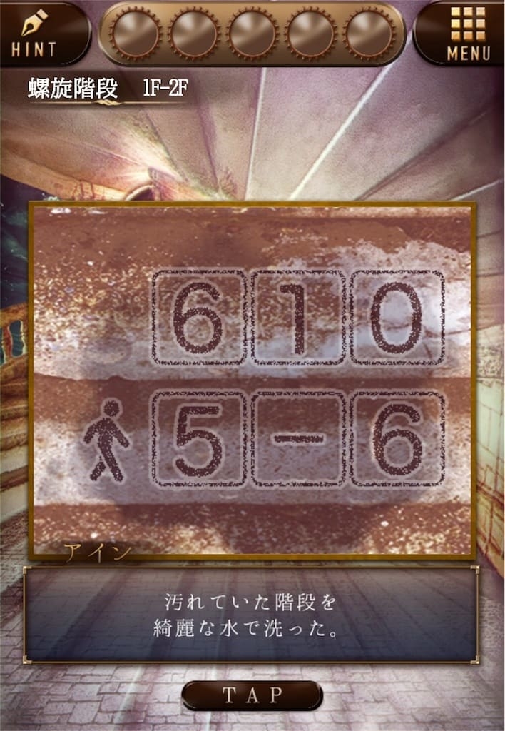 次に、地下水路まで行き「コップ」で水を汲み、螺旋階段の汚れた階段に使用すると「マークと数字」が確認できる。